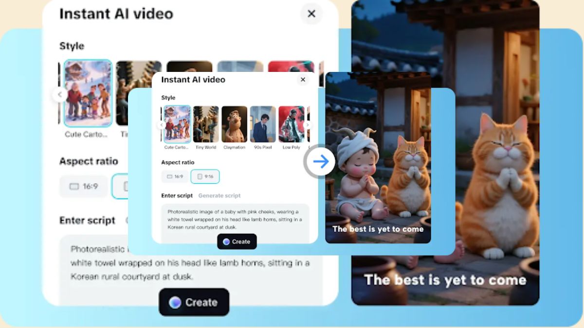 | Instant AI Video | Converts scripts to videos in one click with automated scene arrangement. |